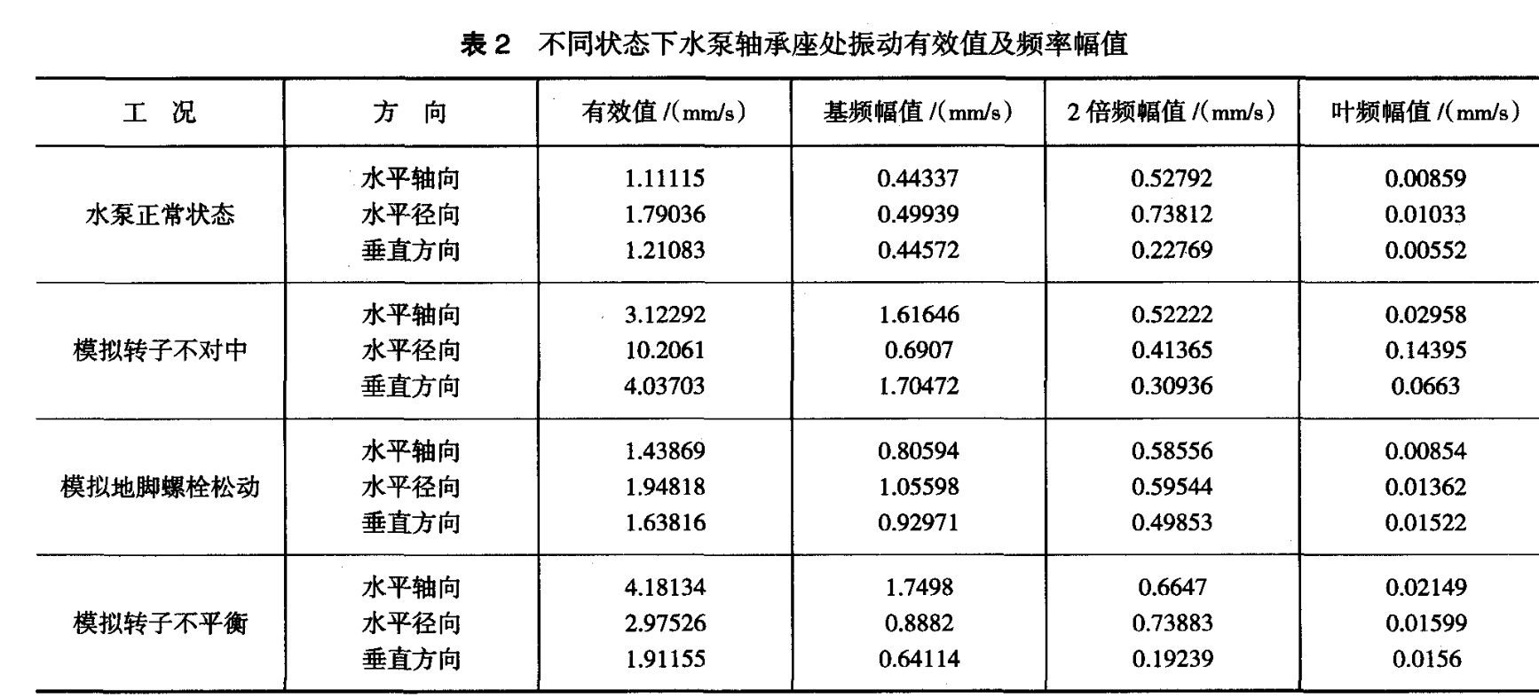 1) 當(dāng)出現(xiàn)轉(zhuǎn)子不對中時(shí),水泵在水平軸向、 水平徑向以及垂直方向振動有效值、基頻幅值及葉 頻幅值明顯增大,在水平徑向、水平軸向整體振動 幅值增加顯著;