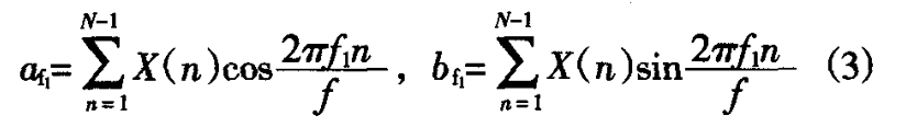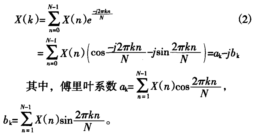 在計(jì)算機(jī)中直接進(jìn)行傅里葉變換(DFT)的運(yùn)算 量與信號長度N的乎方成正比,運(yùn)算量太大,工 程應(yīng)用時(shí)一般采用快速傅里葉變換(FFT)算法, FFT算法通過仔細(xì)選擇和重新排列中間結(jié)果,在速 度上有明顯優(yōu)勢。對于采樣頻率為/、采樣點(diǎn)數(shù)為 N的時(shí)間序列尤U),其離散的傅里葉級數(shù)由式(1) 可表示為
